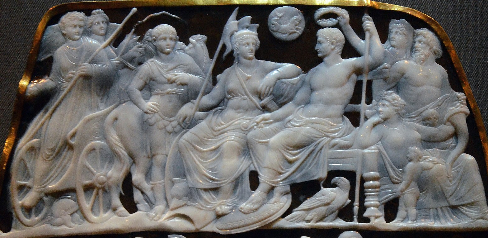 ROOMAN ENSIMMÄINEN KEISARI AUGUSTUS (HALLITSI 27 EKR.–14 JKR.) VALTAISTUIMELLAAN VOITONSEPPELE PÄÄNSÄ YLÄPUOLELLA. GEMMA AUGUSTEA, WIENIN TAIDEHISTORIALLINEN MUSEO (KUVA: JAMES STEAKLEY / WIKIMEDIA COMMONS)
